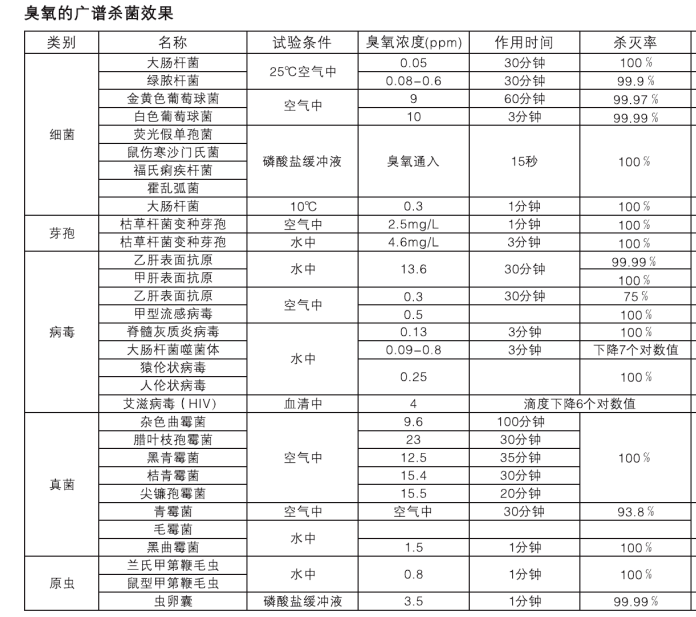 臭氧具有極強(qiáng)的氧化性的特點(diǎn),被世界公認(rèn)是一種廣譜高效殺菌劑,它的氧化能力高于氯一倍,滅菌比氯快600-3000倍,甚至幾秒鐘內(nèi)可以殺死細(xì)菌,對于常見的大腸桿菌、糞鏈球菌、綠膿桿菌、金黃葡萄球菌、霉菌等,在臭氧的環(huán)境中5分鐘,其殺滅率可達(dá)到99%以上。