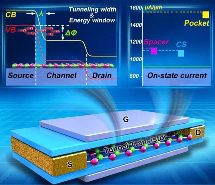 隧道場效應晶體管(TFET-Tunnel Field Effect Transistor),和傳統(tǒng)MOSFET晶體管原理不同,在TFET中源極和漏極摻雜不同。它使用量子力學隧道效應,柵極和源極之間的電壓決定了電荷載流子是否可以“隧穿”通過源極和漏極之間的能量勢壘,以及電流是否可能流動。