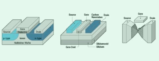 由于量子力學隧道效應,電子可以穿越絕緣體,這將使元件功能失效。人們開始尋找一種新型晶體管,可以進一步提高未來集成電路的性能,作為傳統(tǒng)晶體管的替代品。目前有很多研究,但還沒有領先者可以取代硅MOSFET。研究人員列出了一系列MOSFET替代品,包括隧道場效應晶體管TFET,碳納米管場效應晶體管,單原子晶體管。