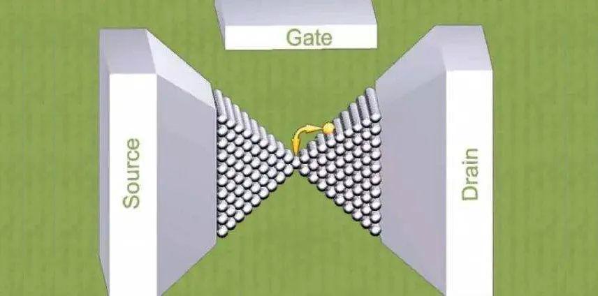 在單原子晶體管中,通過源極和柵極之間的電壓移動單個原子,從而關閉或打開源極和漏極之間的電路。