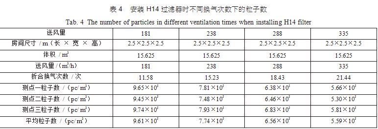 在空調(diào)機(jī)房中新建了三間2.5m×2.5m×2.5m的潔凈間,從空調(diào)主風(fēng)管引風(fēng),每支支管設(shè)置調(diào)節(jié) 閥,并設(shè)排風(fēng)機(jī)進(jìn)行全排,送回風(fēng)口及測點(diǎn)布置分別如圖 3(每點(diǎn)取樣三次,取平均值)。考慮到初中效過濾器對最后潔凈度的影響和最后理論塵埃數(shù)量 計(jì)算的方便,試驗(yàn)用初中效繼續(xù)分別為G4、F8,三個(gè)房間分別安裝高效過濾器,風(fēng)量500m3/h,第一組數(shù)據(jù)為送風(fēng)量按GMP 驗(yàn)證指南推薦換氣次數(shù)保持不變,分別用H12、H13、H14、U15過濾器,第二組數(shù)據(jù)為采用H13高效過濾器,調(diào)節(jié)風(fēng)量 ;第三組數(shù)據(jù)為采用H14高效過濾器,調(diào)節(jié)風(fēng)量,分別測得塵埃粒子數(shù),并列表得出不同的換氣次數(shù)下對應(yīng)的塵埃數(shù)如表2、表3、表4。
